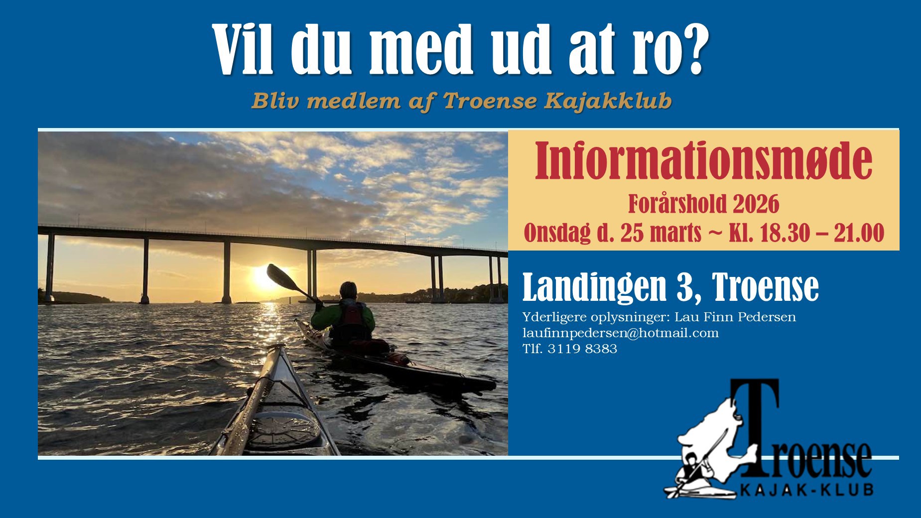 Onsdag den 25. marts inviterer vi til en uforpligtende aften i klubhuset, hvor vi fortæller om uddannelsen og Troense Kajakklub. Er du interesseret, så er det blot at møde op i klubhuset på havnen i Troense klokken 18.30. (Adresse: Landingen 3, Troense).